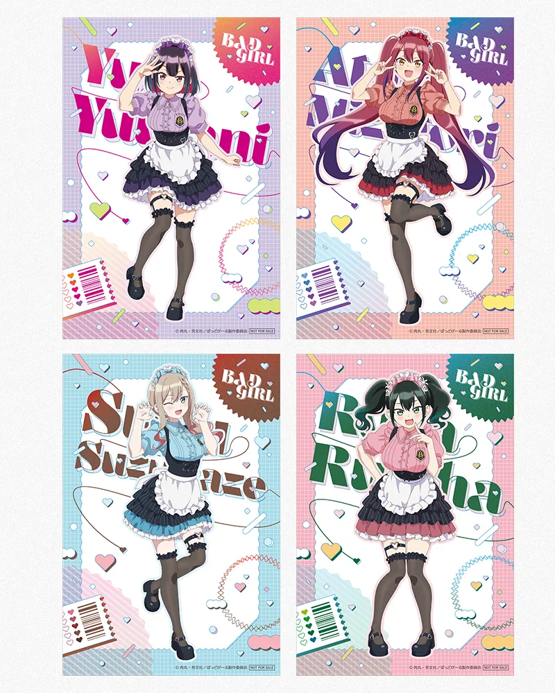 コラボカフェ期間中、物販コーナー(同ビル1階グランエンタス)にて『ばっどがーる』関連商品お買い上げ¥3,000(税込)ごとにランダムで1枚お渡しします。コラボカフェと合わせてご利用ください。
